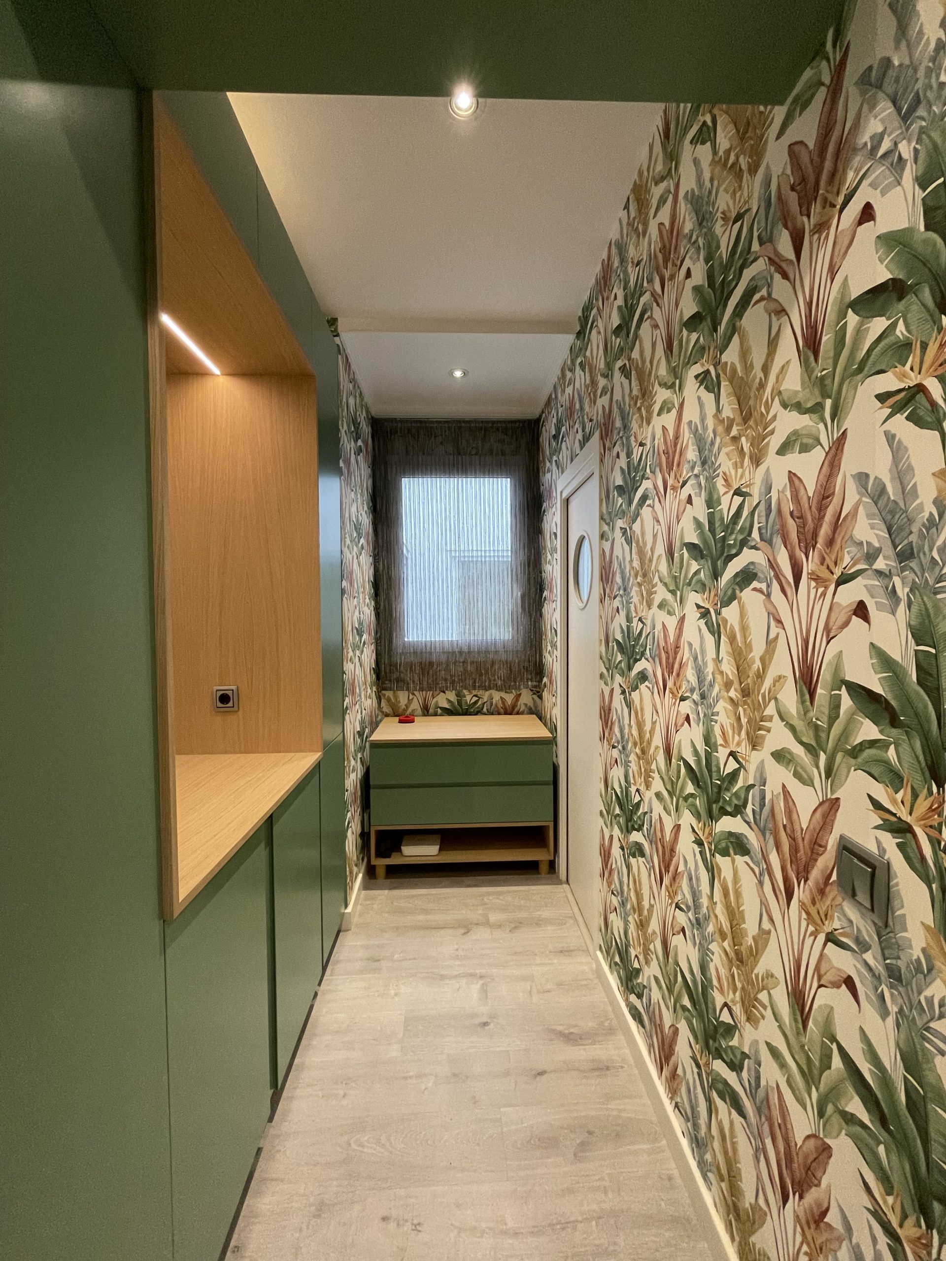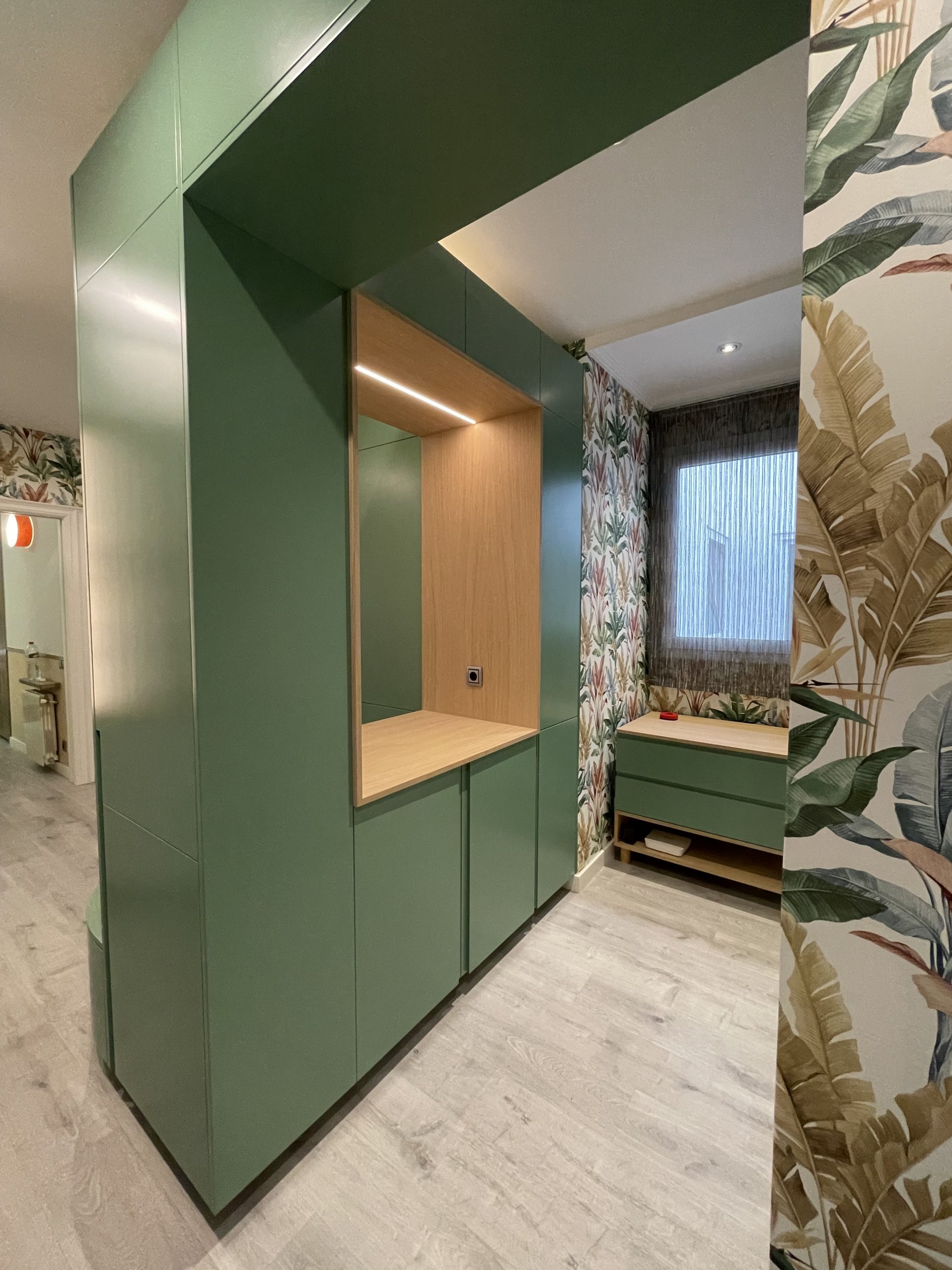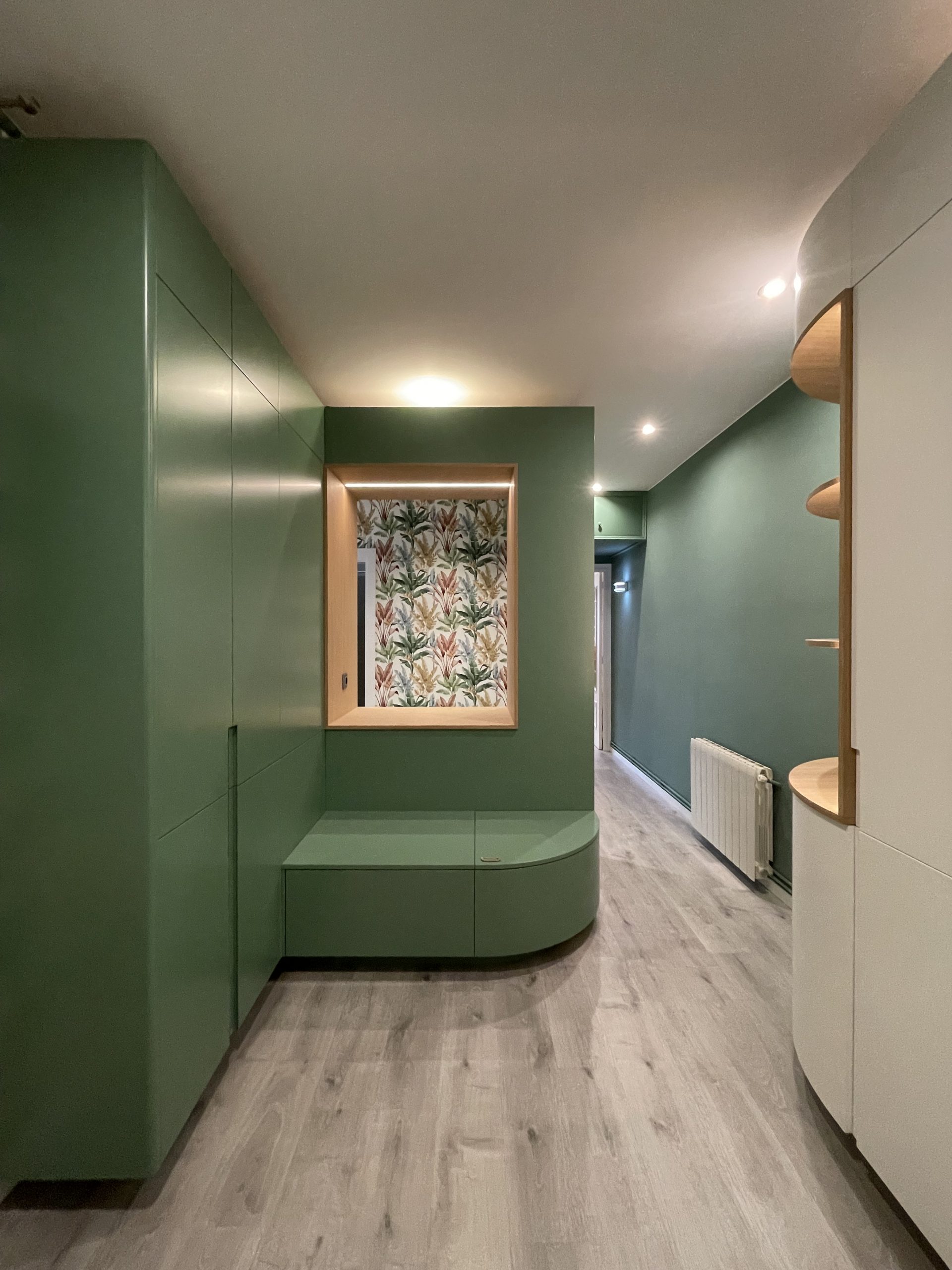 • Recibidor útil y cálido: diseñamos un frente a medida con almacenaje oculto, banco para calzarse y espacio para bolsos/abrigos. Replanteamos los ejes para quitar de vista la puerta del baño al entrar.