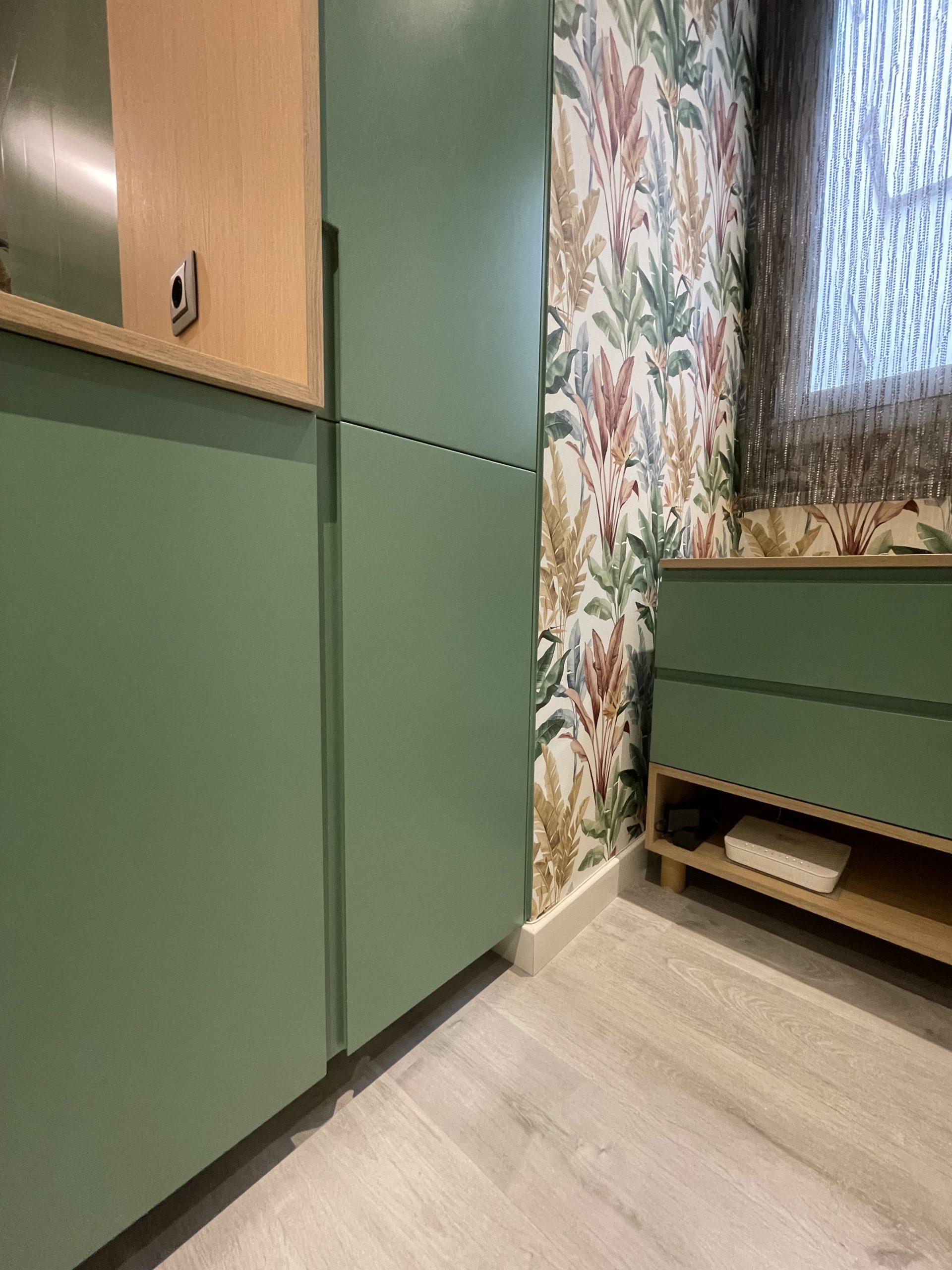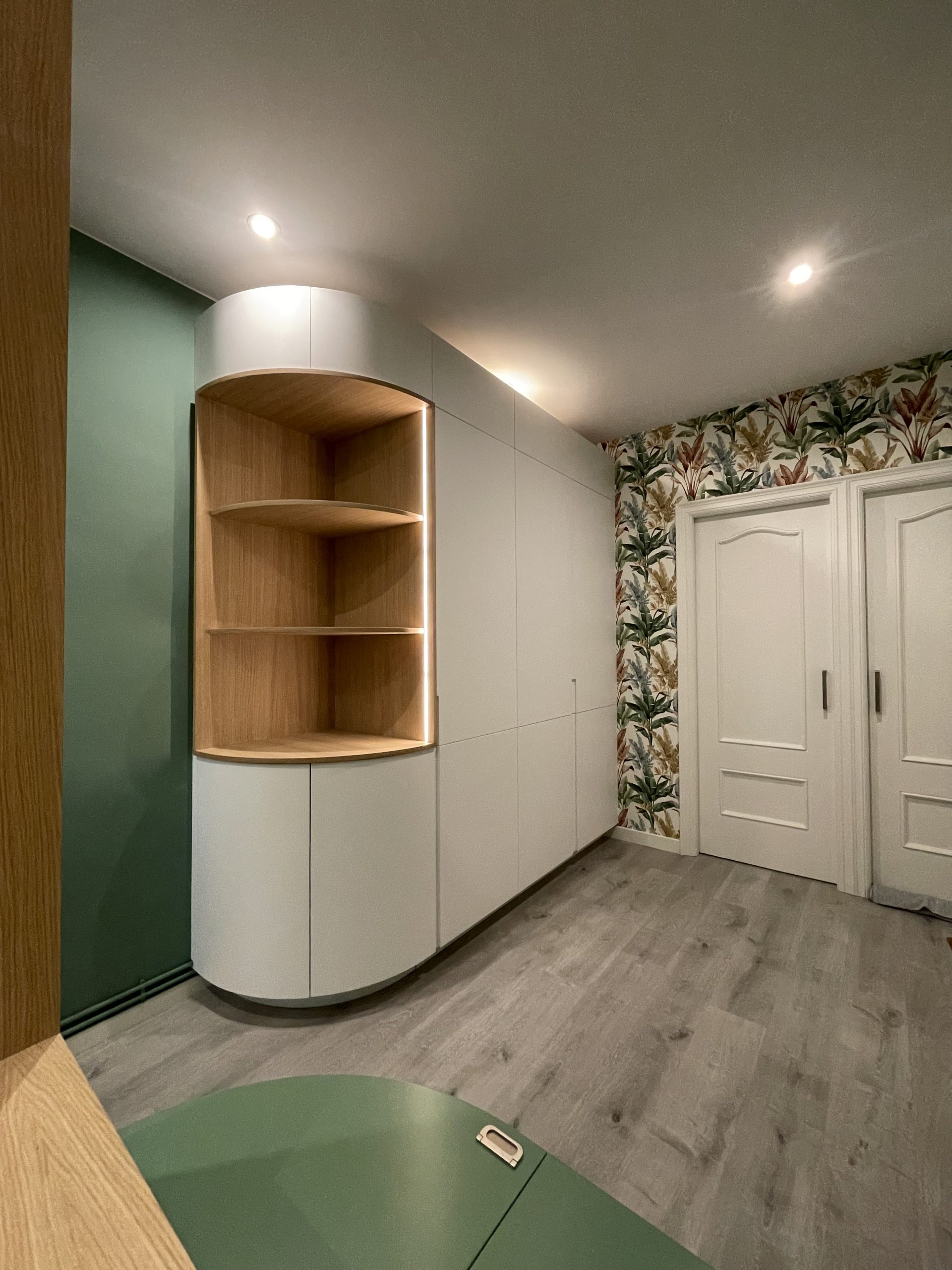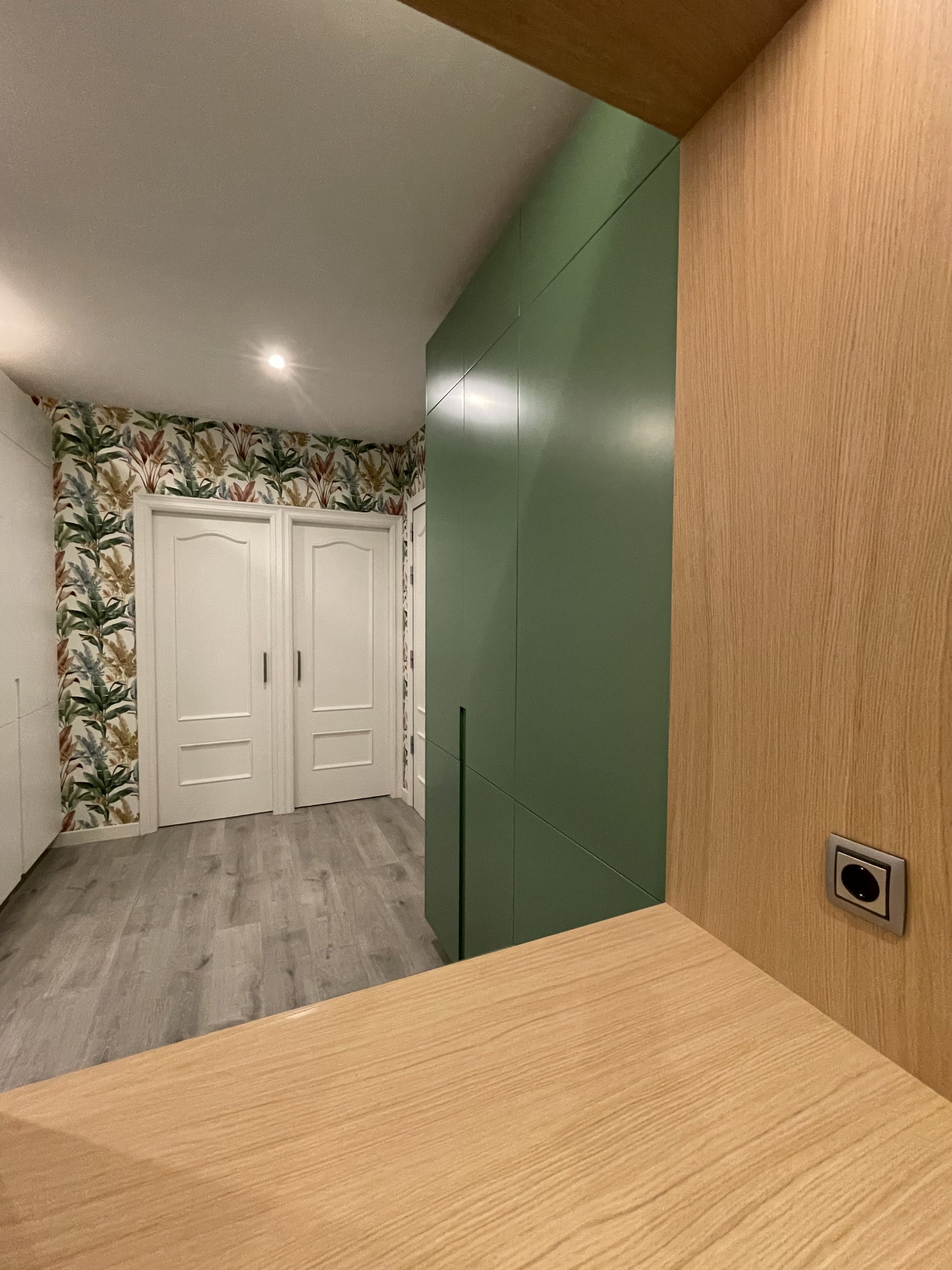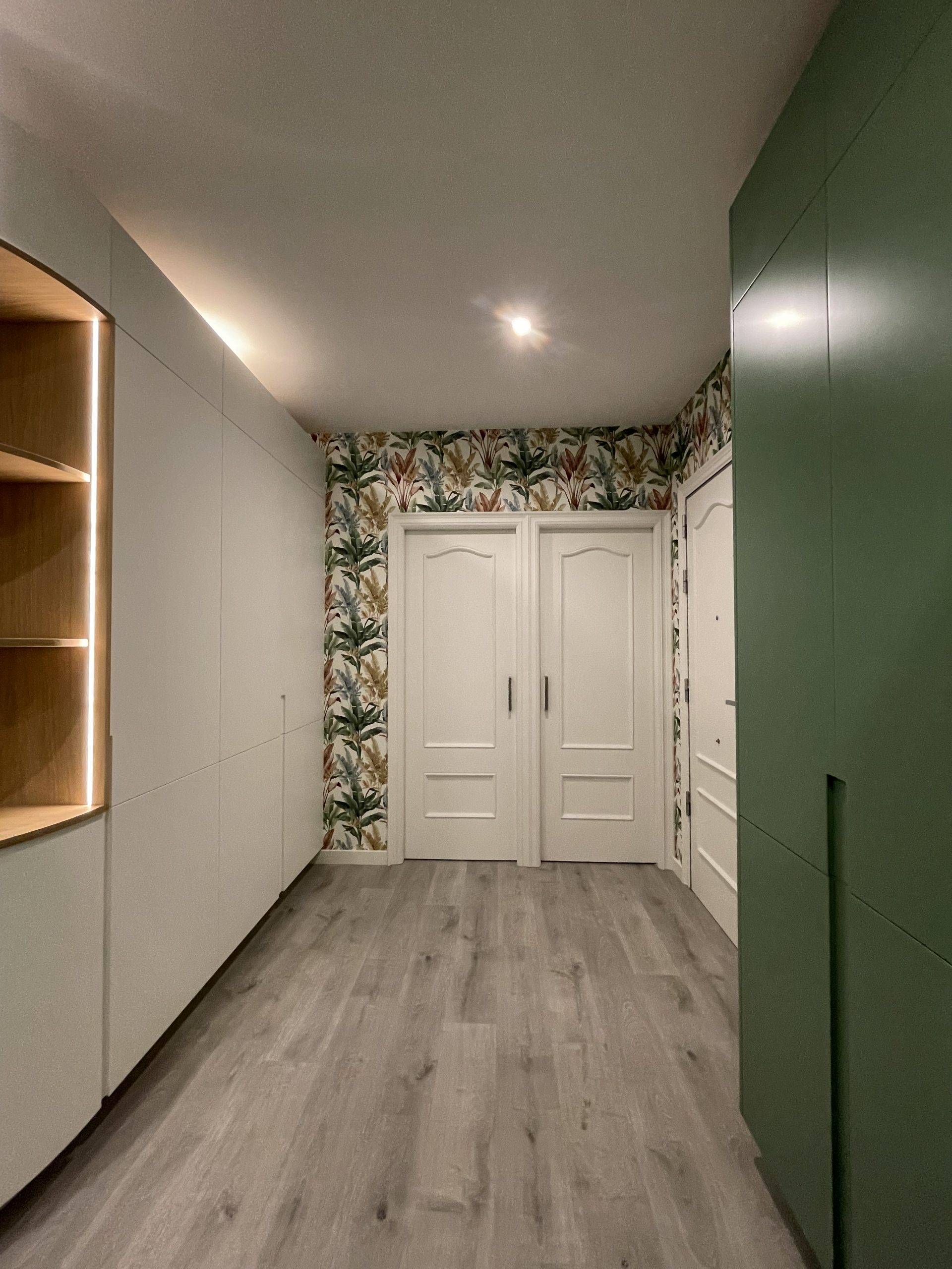 • Recibidor útil y cálido: diseñamos un frente a medida con almacenaje oculto, banco para calzarse y espacio para bolsos/abrigos. Replanteamos los ejes para quitar de vista la puerta del baño al entrar.