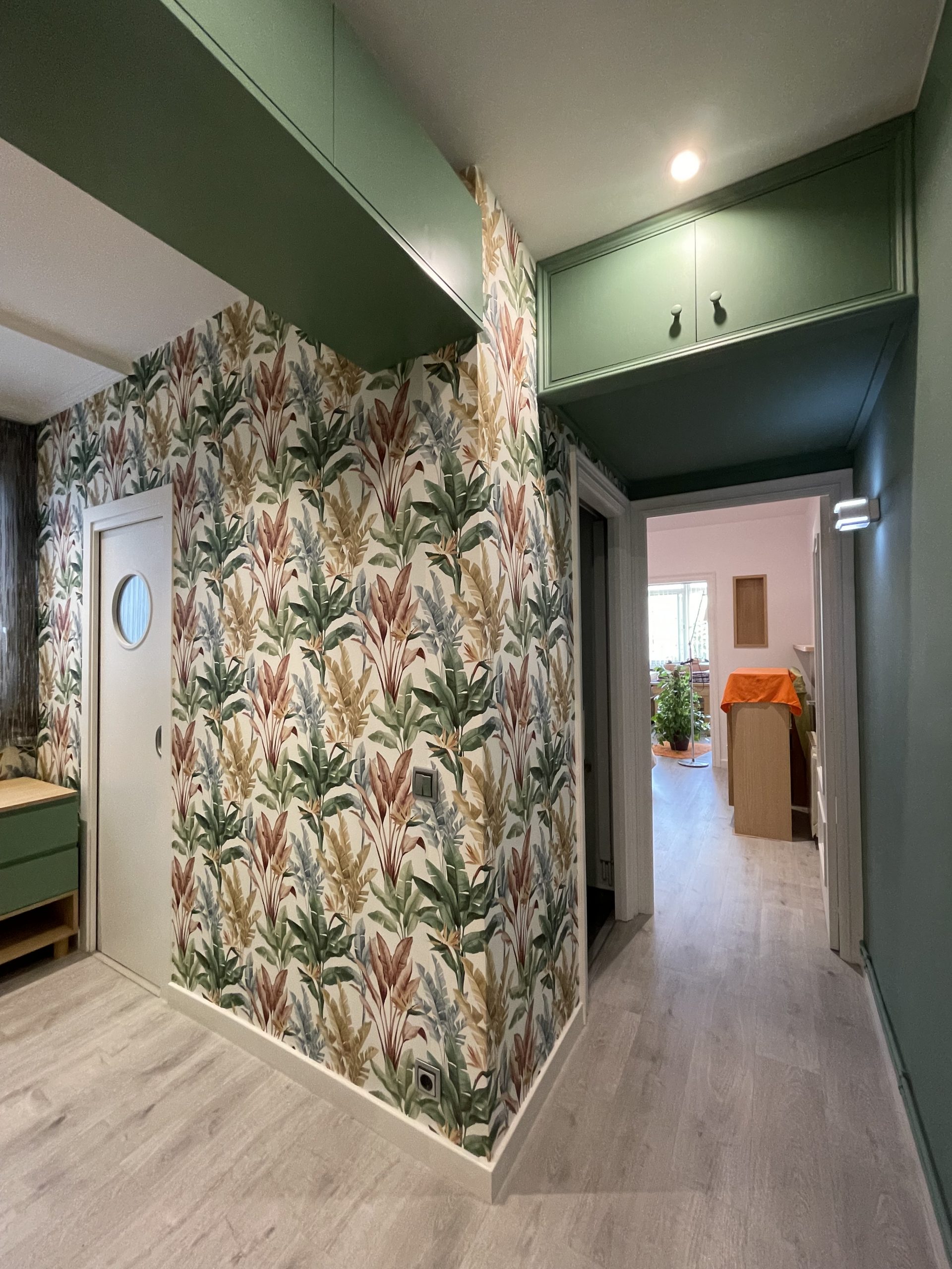 • Papel pintado en el recibidor con variaciones de verde para textura y profundidad.