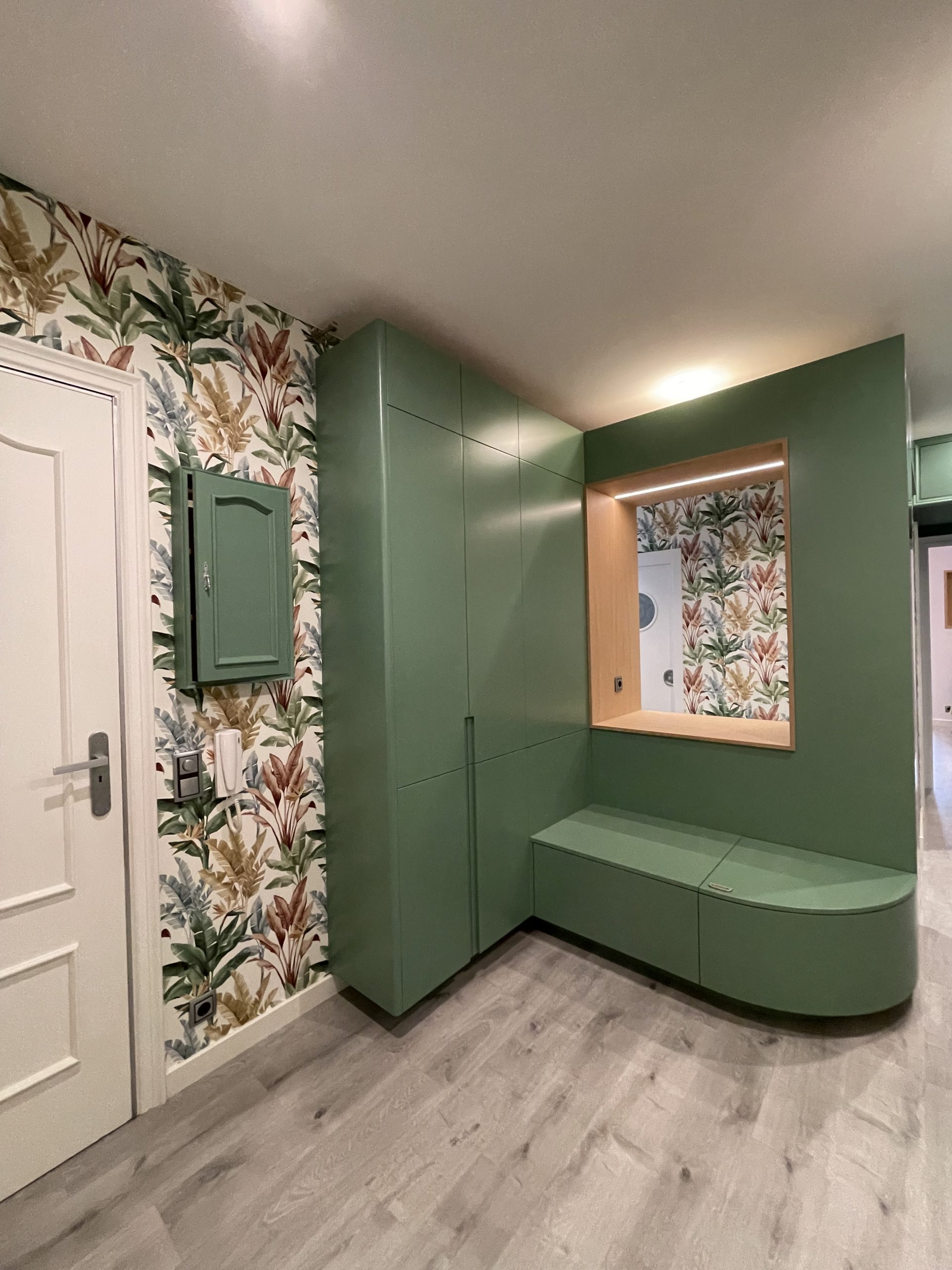 • Colores que conversan: elegimos verde para el recibidor y azul para el salón; paleta pensada para encajar con el parquet gris y dialogar entre estancias.