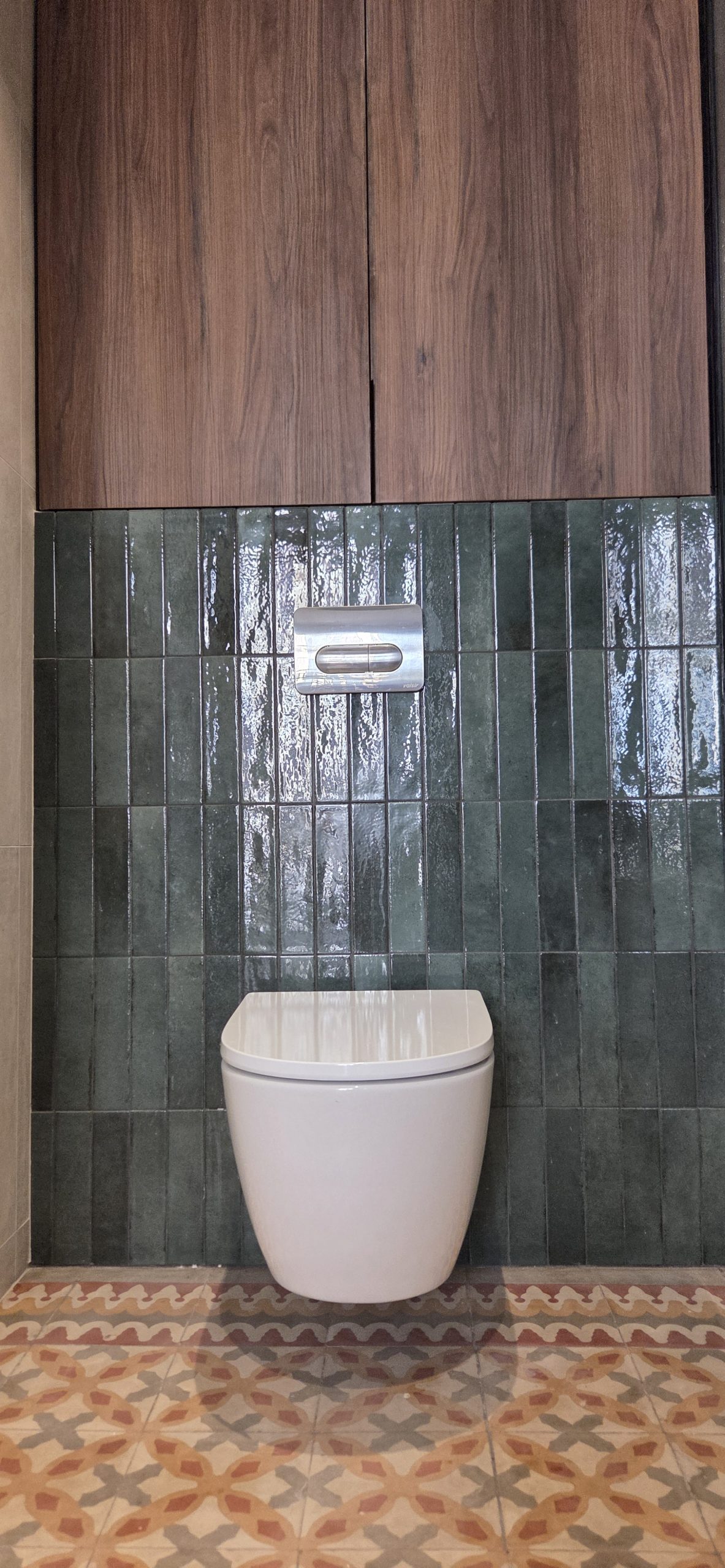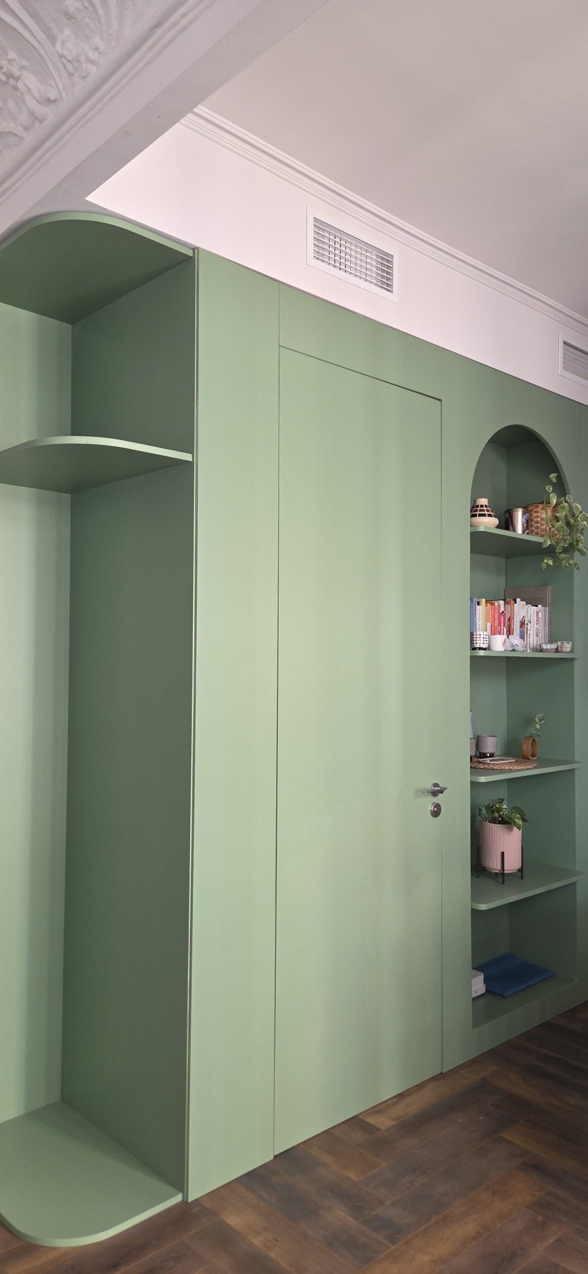La paleta que ella deseaba: verde. En cocina, frentes verdes; en baño, verde esmeralda; en despacho, un verde más suave.