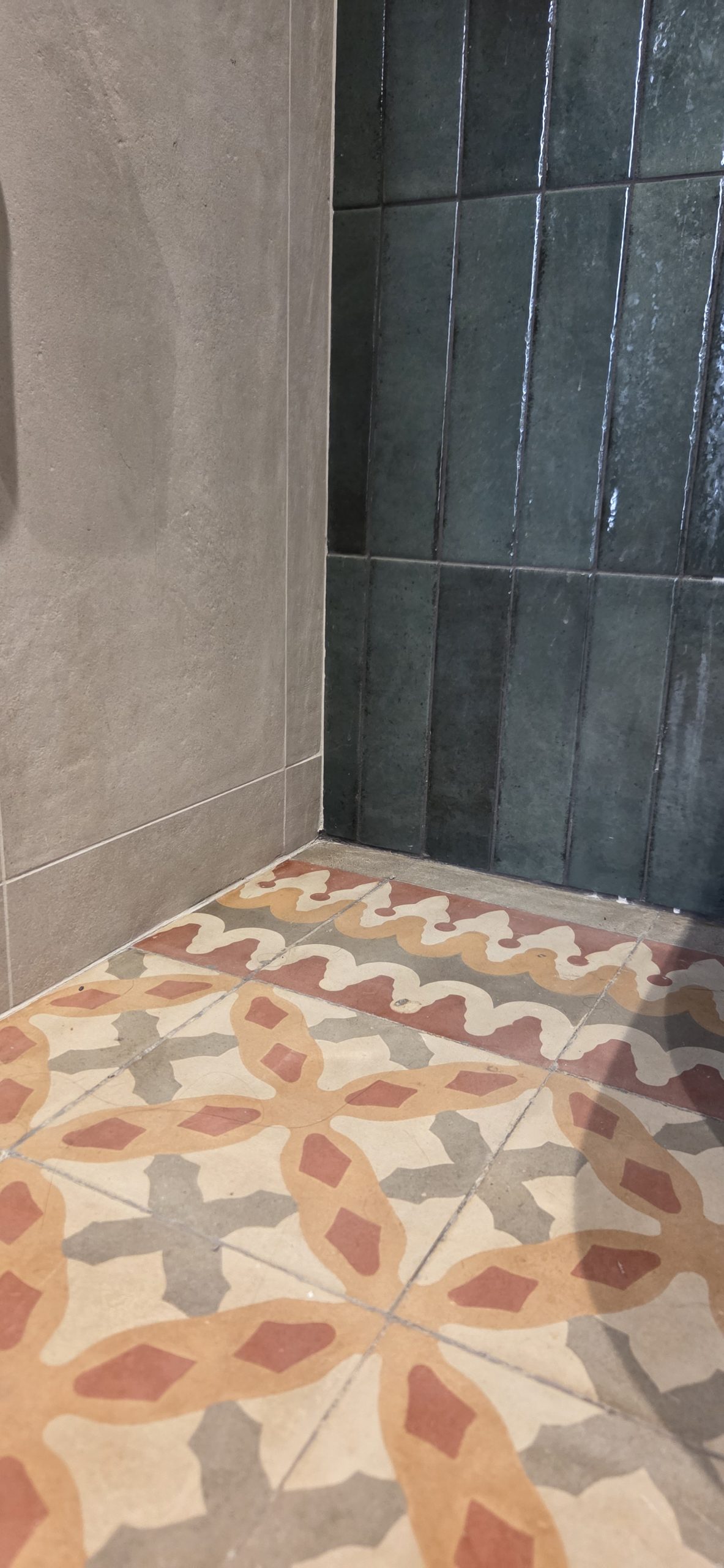 Suelos hidráulicos: mantuvimos el original del baño y recuperamos piezas encontradas en el salón para recolocarlas en la galería.