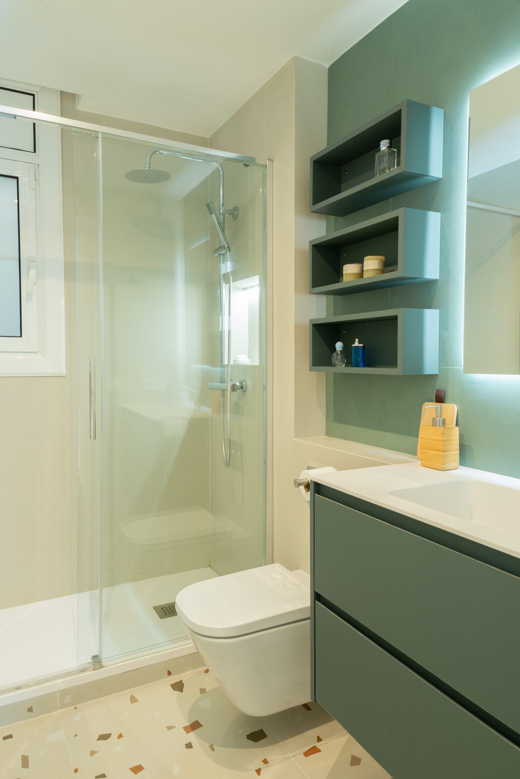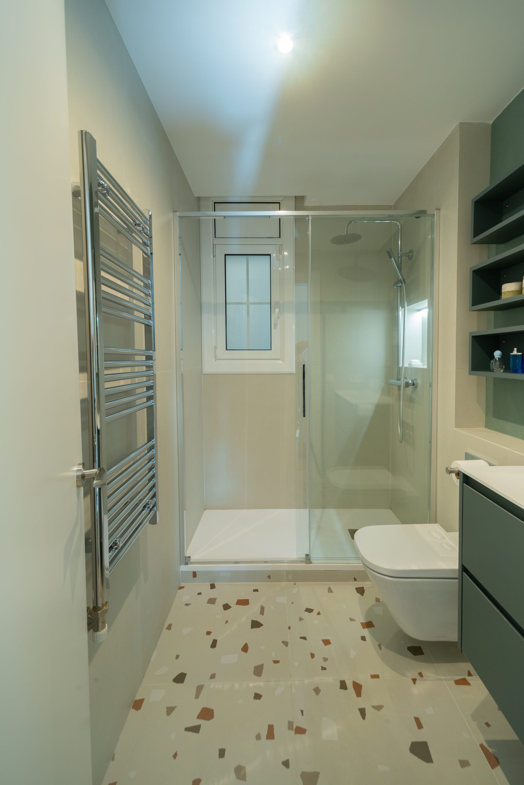 Reorganizamos piezas: lavamanos junto al WC i ducha de pared a pared para ganar orden y uso real.