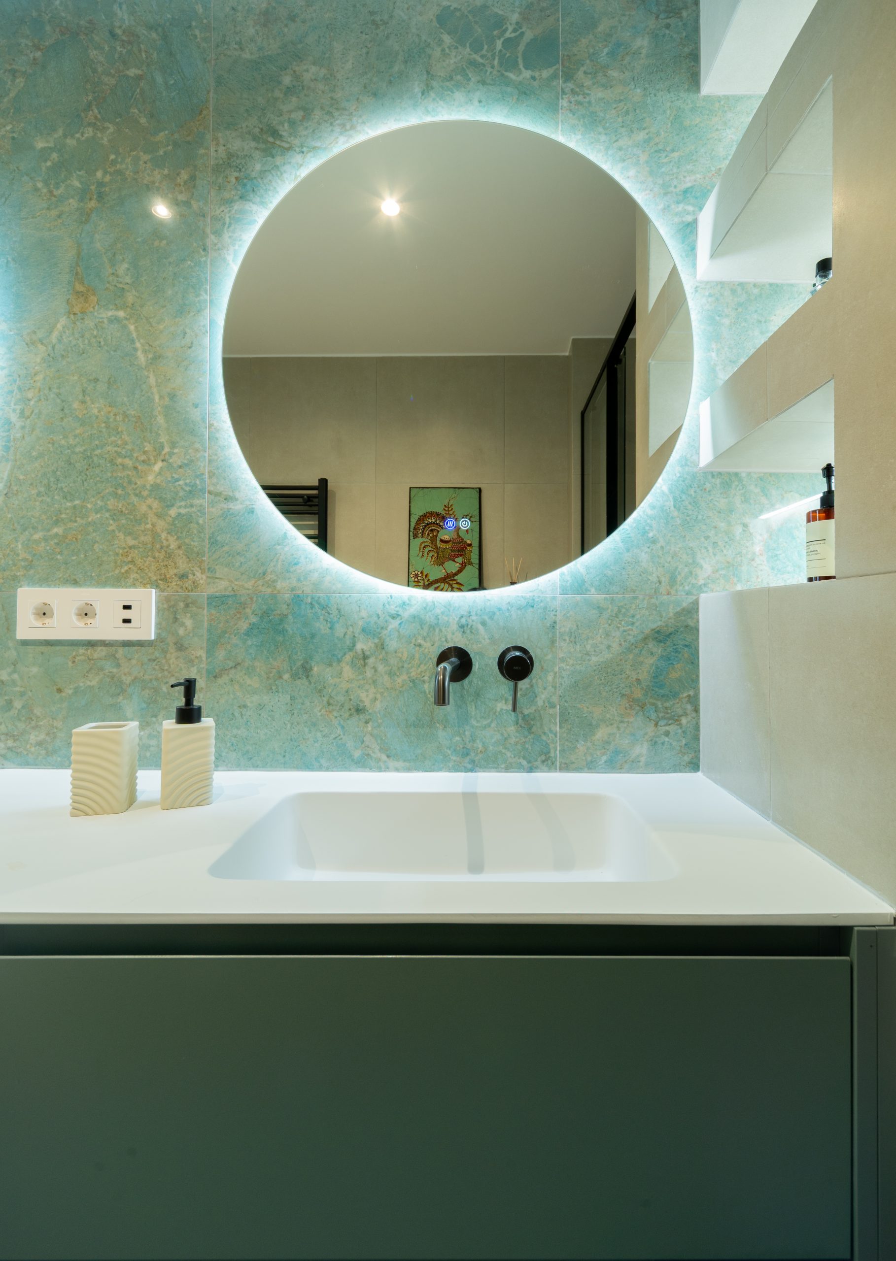 Paleta serena: mueble verde y un frente cerámico aguamarina que evoca el mar; el resto, beige neutro en suelo y paredes para que el conjunto respire.