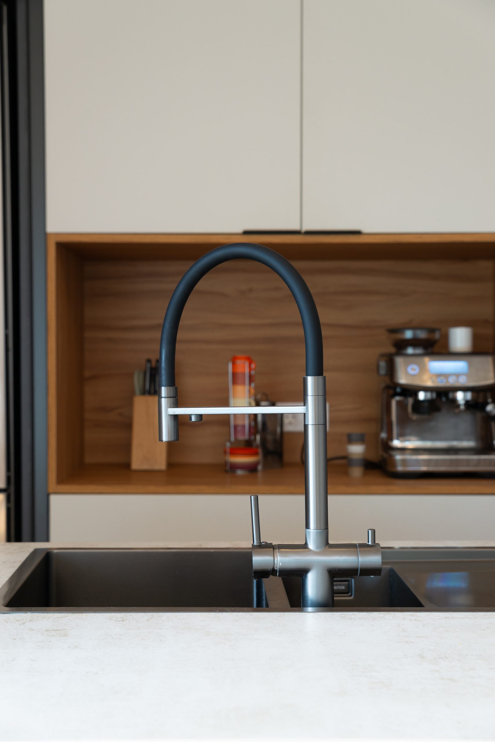 Cocina abierta al salón-comedor para cocinar mirando al jardín y al Mediterráneo y socializar sin barreras.