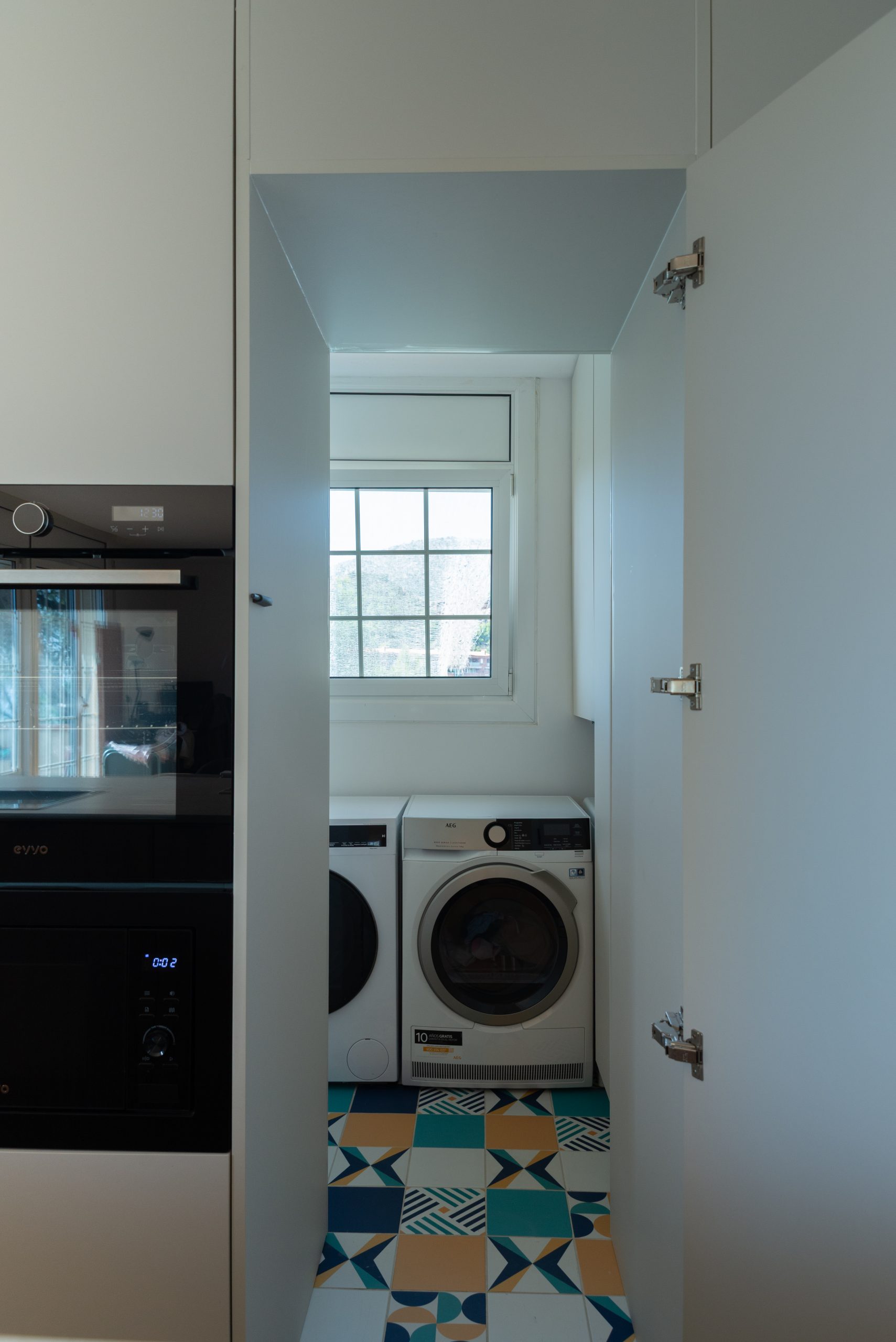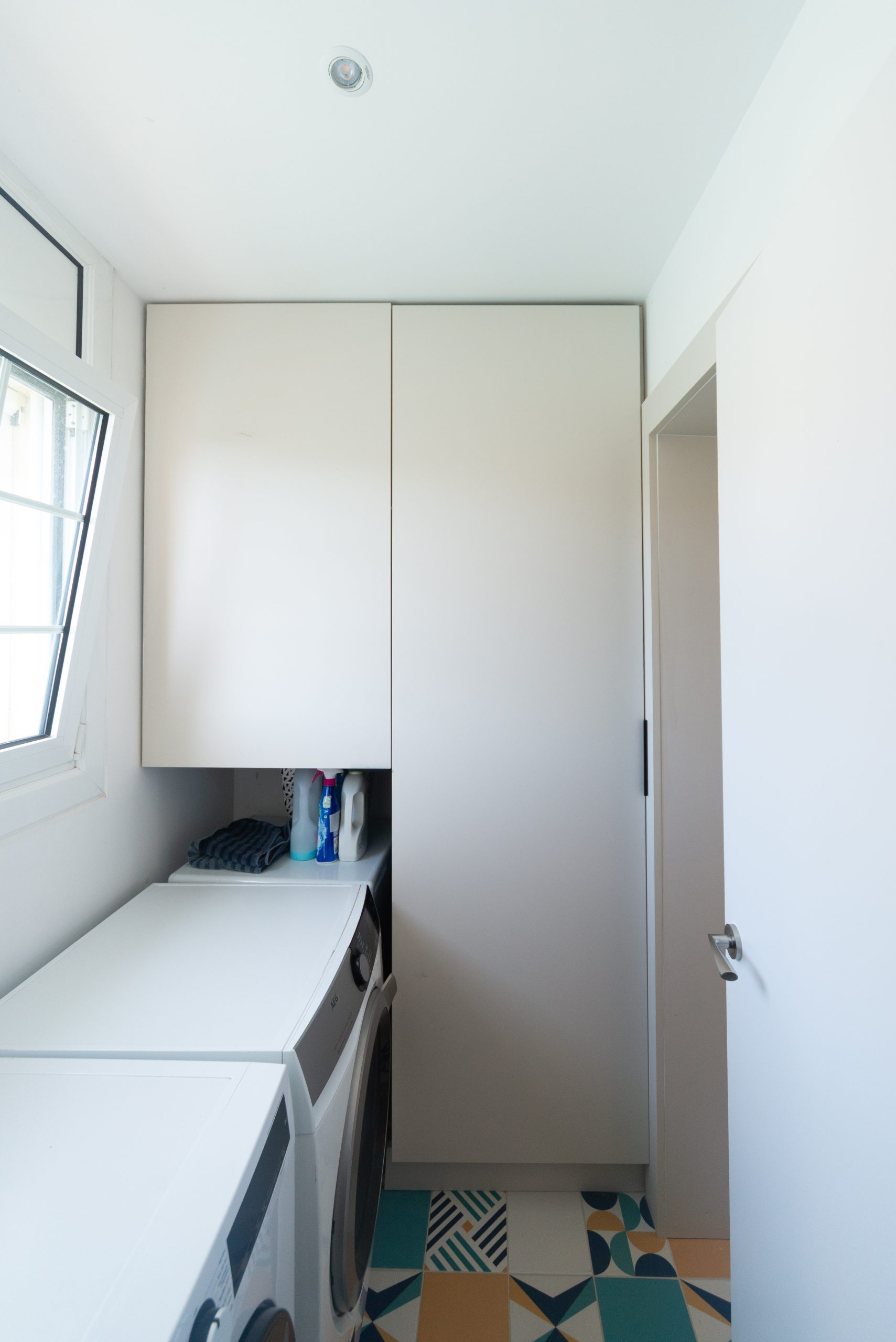 Ella es brasileña, él alemán, y tienen dos hijos. La casa habla su idioma: color con criterio, maderas restauradas y una barandilla azul que mira al cielo. En los baños, el verde trae calma; en la cocina, el pavimento pone la nota alegre. Todo equilibrado por una base neutra y luminosa.
