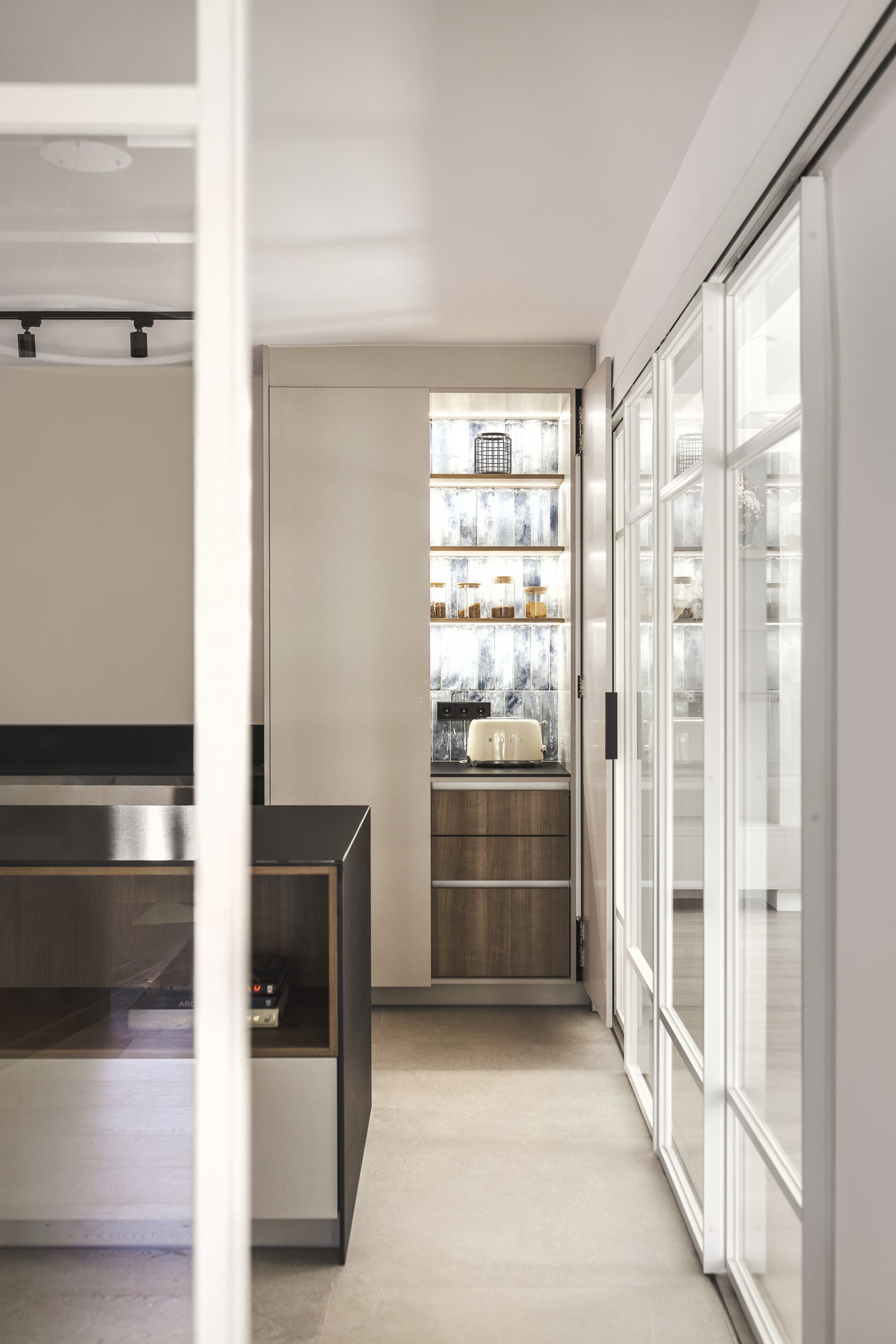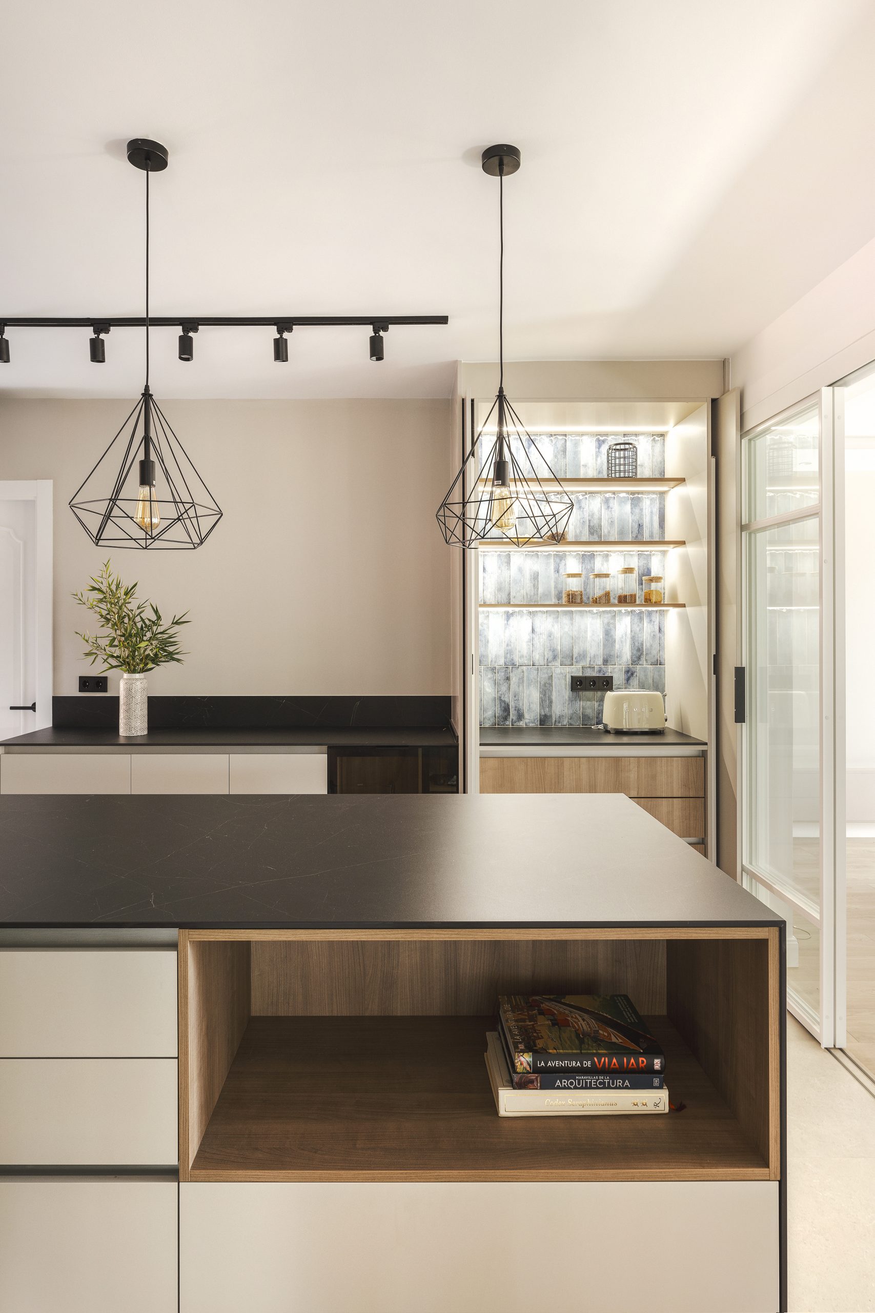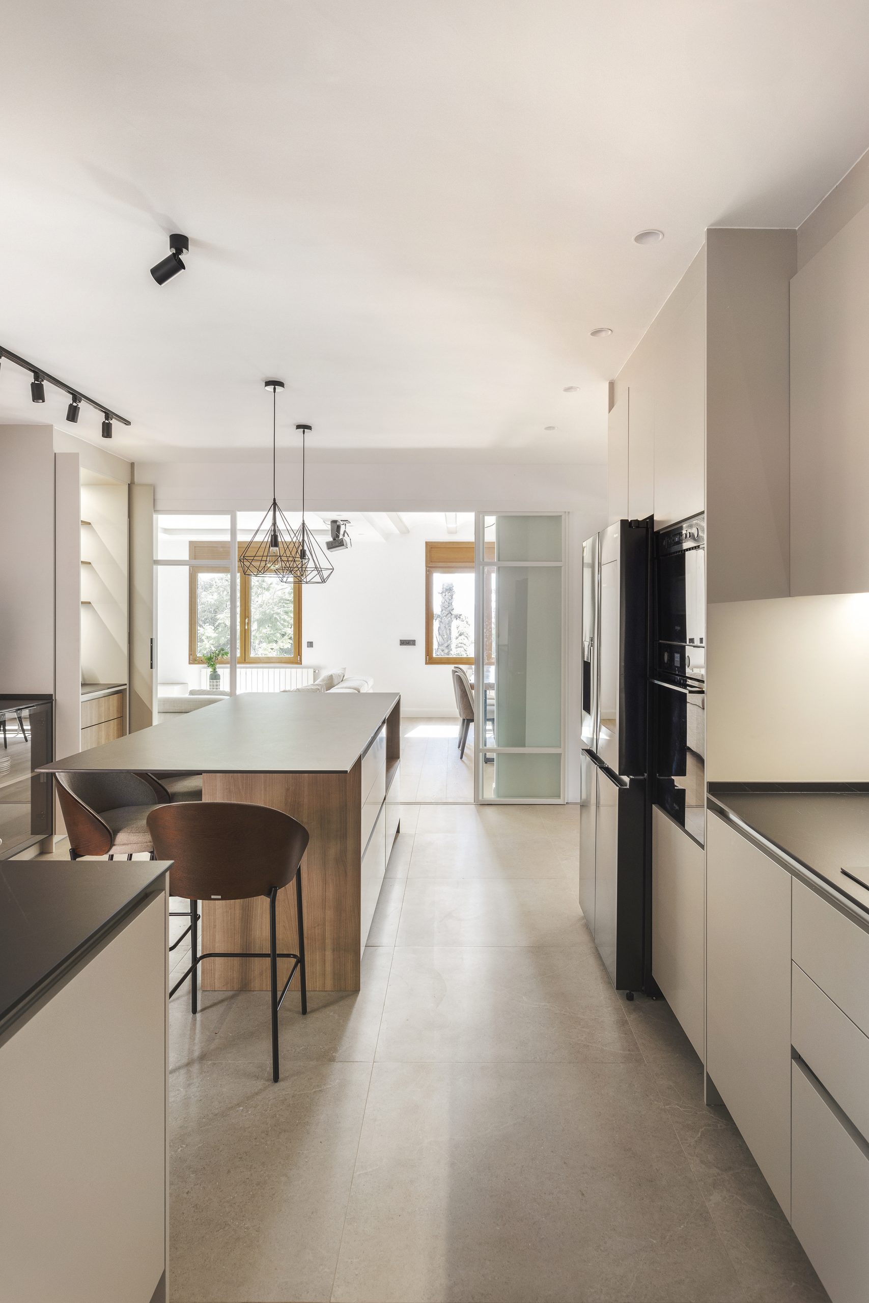 • Acercamos la cocina al salón sin abrir al 100%: ampliamos la cocina eliminando el pasillo que los separaba.